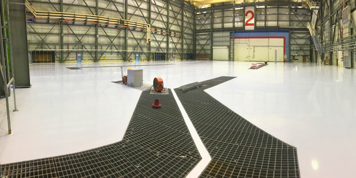 Seamless ESD flooring in jet hangars ensure protection for sensitive avionics and equipment.